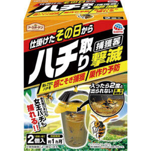 ● 仕掛けたその日からお庭まわりに飛来したハチを駆除できる捕獲器。誘引捕獲液が身体にすばやく密着し、すばやく沈めて、一度入ったら逃しません。春先に飛び回る女王バチも捕れる。● 容量/2個対象害虫/ハチ(スズメバチ、アシナガバチ、ドロバチ等)、コガネムシ、ガ※ミツバチは誘引・捕獲されません。持続期間/夏:約20日‐30日間、春・秋:約30日‐40日間(気象条件などにより異なります)セット内容/2個(フタ、屋根、誘引捕獲液、下容器、吊り下げひも、注意喚起シール)寸法/幅116×奥行116×高さ146mm使用の目安/お庭等に1個(約10坪あたり1個)単位/1箱(2個入)● 【設置時の注意】※屋外に設置してください。※ハチがあまり飛んでいない時間帯(早朝や夕方以降)に設置してください。※巣から近い場所への設置はしないでください。※周りにハチがいないことを確認して設置してください。ハチに不用意に近づくと危険です。※人通りが多い場所や家の軒下、ベランダ等からは離して設置してください。※子供やペットが触れたり、いたずらしないよう注意してください。【回収時の注意】※回収後はフタを開けず、ハチが完全に死んでいることを確認してそのまま廃棄してください。※容器内のハチがまだ生きている場合は、絶対にフタを閉めたまま、中にハチ用駆除剤スプレーを使用する等して、死んだことを確認してから廃棄してください。