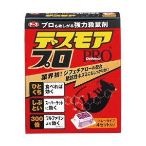 ● 濡れたところや汚れたところへも置ける、トレータイプのネズミ用強力殺鼠剤● 種別/トレータイプ容量/15g×4個成分/ジフェチアロール0.0025%(w/w)使用目安/ねずみがよく出る場所に容器ごと(1gから3g)設置対象害獣/ネズミ販売名/デスモアD5寸法/奥行38×幅146×高さ176(mm)その他仕様/防除用医薬部外品単位/1箱(4個入)● ※メーカーの都合によりパッケージが予告なく変更される場合があります。