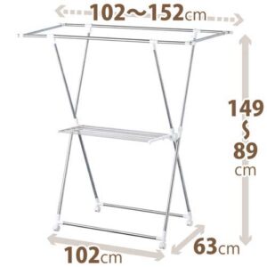 ● 下段は大判バスタオルが干せるサイズ設計。補助バーが付いているのでたくさん干せます。● 質量/約4kg材質/本体:ステンレス巻きスチールパイプ、ステンレスパイプ、樹脂部品:ポリプロピレン、ABS樹脂、ナイロン、金属部品:スチール(メッキ)、ステンレス耐荷重/11kg(全体)付属品/キャスター(ストッパー付2個、ストッパーなし2個)寸法/展開時:約幅1020から1520×奥行630×高さ890から1490mm 収納時:約幅1020×奥行160×高さ950mm使用の目安/下段:大判バスタオル6枚、フェイスタオル12枚 上段:ワイシャツ38枚単位/1台●