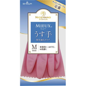 ● 傷つきやすい指先を強化した家事や清掃作業等におすすめのやわらかい薄手の塩化ビニール製ゴム手袋です。● サイズ/M寸法/全長300×中指長さ78×掌幅100mm材質/PVC(非フタル酸エステル系可塑剤)カラー/ピンク単位/1双● ※アレルギー反応等により、体質によっては、かゆみ・かぶれ・発疹等おこすことがあります。異常を感じたら使用を中止し、医師に相談ください。※高濃度の薬品や溶剤(ガソリン・ベンジン類)には長時間使用しないでください。硬化することがあります。※塩化ビニル樹脂は60℃以上の熱に弱いため、熱いものには触れないでください。※爪先・刃物や尖ったもの等で傷をつけないようご注意ください。水がしみこむ原因となります。※感電のおそれがあるため、電気作業には使用しないでください。※調理用には使用しないでください。※使用後は汚れをよく洗い落とし、陰干ししてください。保管する時には直射日光を避けてください。
