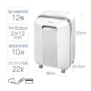 ● トラブルを事前に把握できるLED表示機能搭載のマイクロカットシュレッダー● 投入幅/230mm質量/約9kg消費電力/600W(50・60Hz)運転音/65dB連続使用時間目安/10分機能/自動停止安全スイッチ、投入量感知センサー、オートリバース、ダストボックス満杯センサー、スリープモード、使用状況表示LEDバー、空冷ファン保証期間/1年容量/22L最大細断枚数/12枚寸法/幅360×奥行255×高さ530mmカット種類/マイクロカット細断サイズ/2×12mm細断速度/2.1m/分カラー/ホワイト電源/AC100V(50/60Hz)メディア細断/カード、ホチキス(11号針まで)、クリップ(28mm)メディア投入口/なし処理能力(A4)/約530枚処理時間(A4用紙1枚あたり)(50・60Hz)/約8.4秒単位/1台● 以下の物を投入しないでください。故障や詰まりの原因になります。・粘着シール、宅配便の送り状、各種テープ類など糊の付いた紙・各種フィルム、ビニール、ポリ袋、OHP シート・カーボン紙、インクリボン、新聞紙・布類・和紙など繊維の粗い紙※【返品に関するご注意】開封後はお客様のご都合による返品はお受けできません。